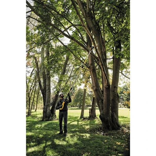 The DEWALT 20V MAX XR Brushless Cordless Pole Saw comes equipped with an 8″. Bar and Chain to handle all of your pruning needs. It features a high efficiency brushless motor that delivers up to 96 cuts per charge. The well balanced design and durable pole shaft extends up to 10′ for a total reach of 15′. It has an auto oiling feature for added convenience and time saving. It also features metal bucking strips for a durable cutting grip and a tree hook allows you to easily remove pruned branches.