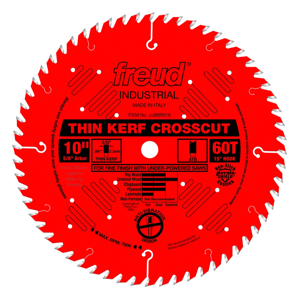 Provides a fine finish crosscut in hardwoods, softwoods and mouldings with underpowered saws. Thin kerf blade requires less horse power to produce good results. Perma-Shield coating guarantees less working friction and less resin adhesion while preventing the development of rust.