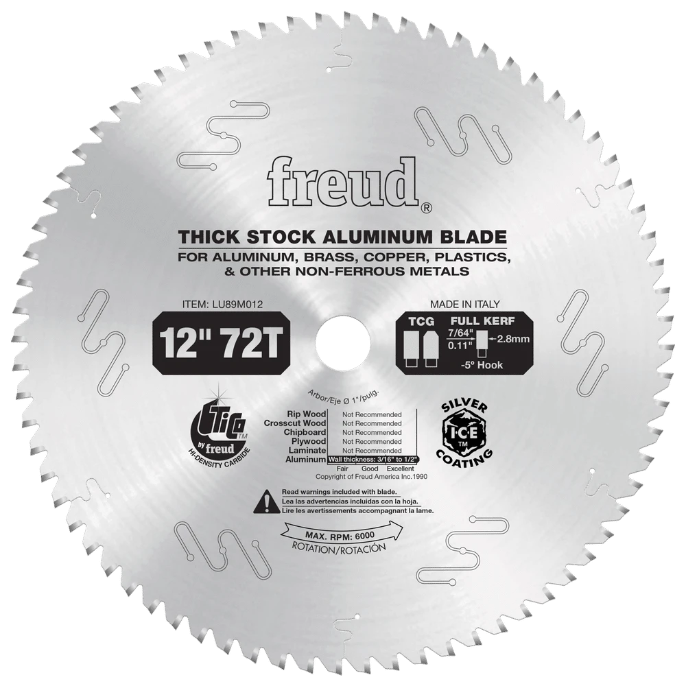 This heavy-duty, non-ferrous metal cutting blade produces an excellent finish. These blades have custom designed gullets to minimize chip build-up and specially formulated carbide for long life. Freud recommends use of a liquid lubricant when cutting. This can be accomplished with a spray of WD-40 or other lubricant every 4 to 5 cuts. Wax sticks are not recommended.